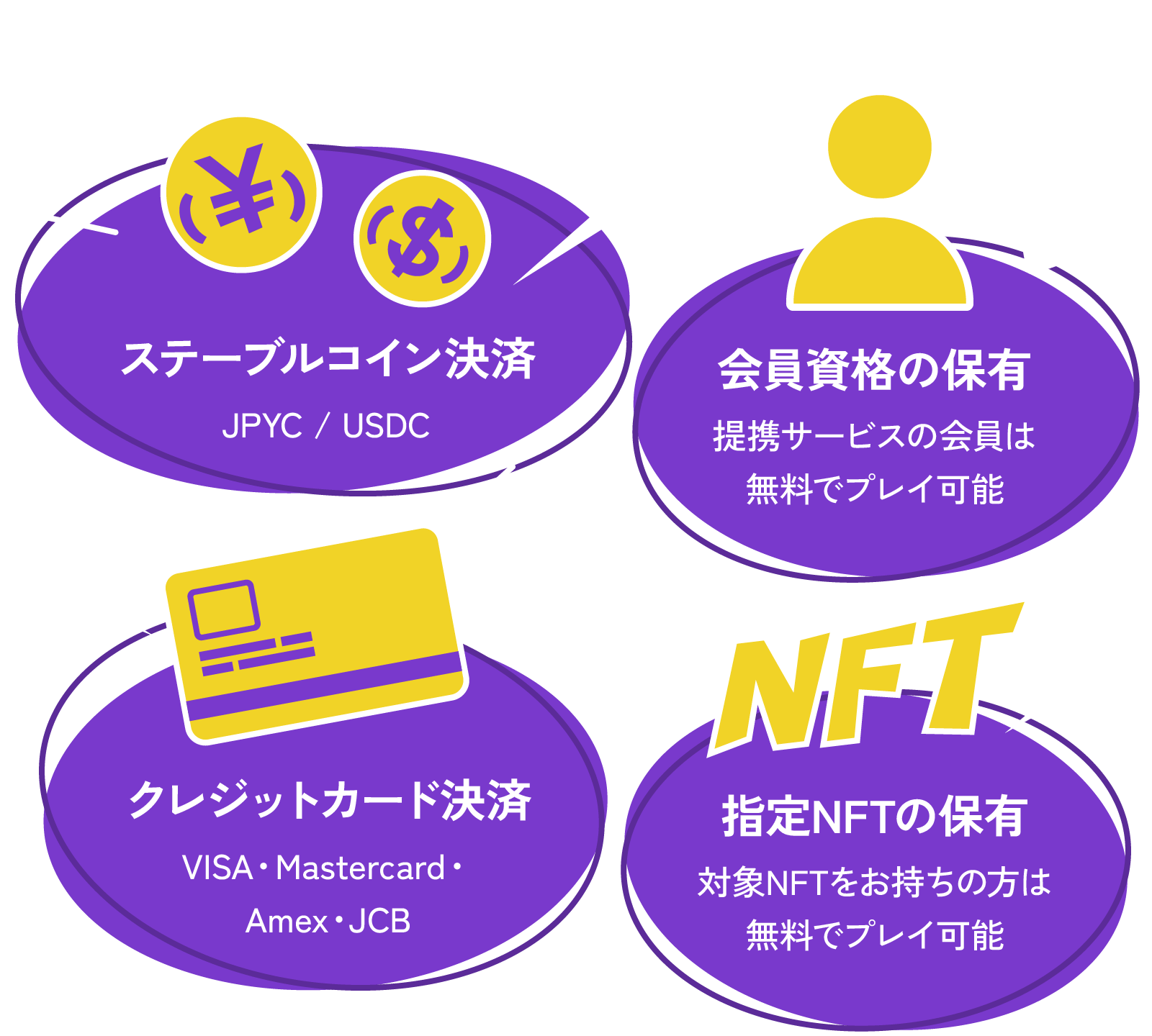 ステーブルコイン決済(JPYC / USDC)、クレジットカード決済(VISA・Mastercard・Amex・JCB)、および会員資格や指定NFTの保有によるプレイに順次対応していきます。